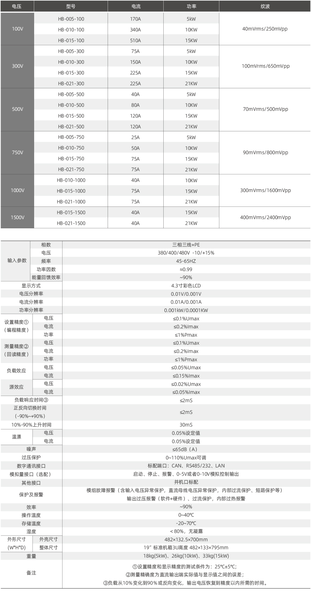 HB系列双向可编程直流测试电源具有源、载一体的特点,既能为负载提供直流供电,也能将电能无污染的回馈到电网;采用标准3U机箱,提供高至15KW的功率输出能力;同时,相同型号的电源可并联,以实现更强大的输出能力。